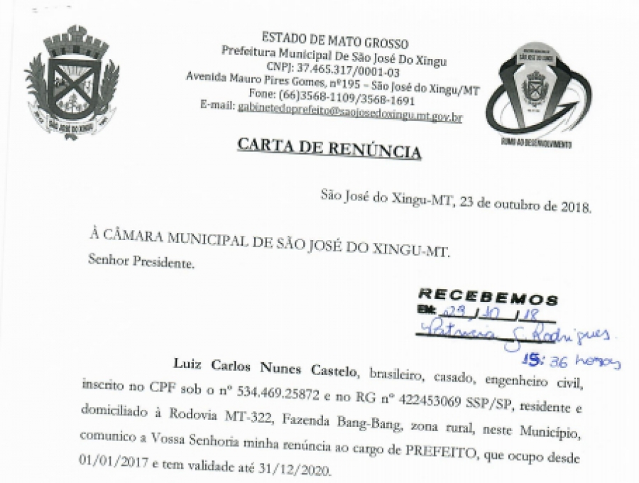 Prefeito Luiz Castelo de São José do Xingu renúncia ao cargo por razões pessoais e submetendo-se a apelo familiar