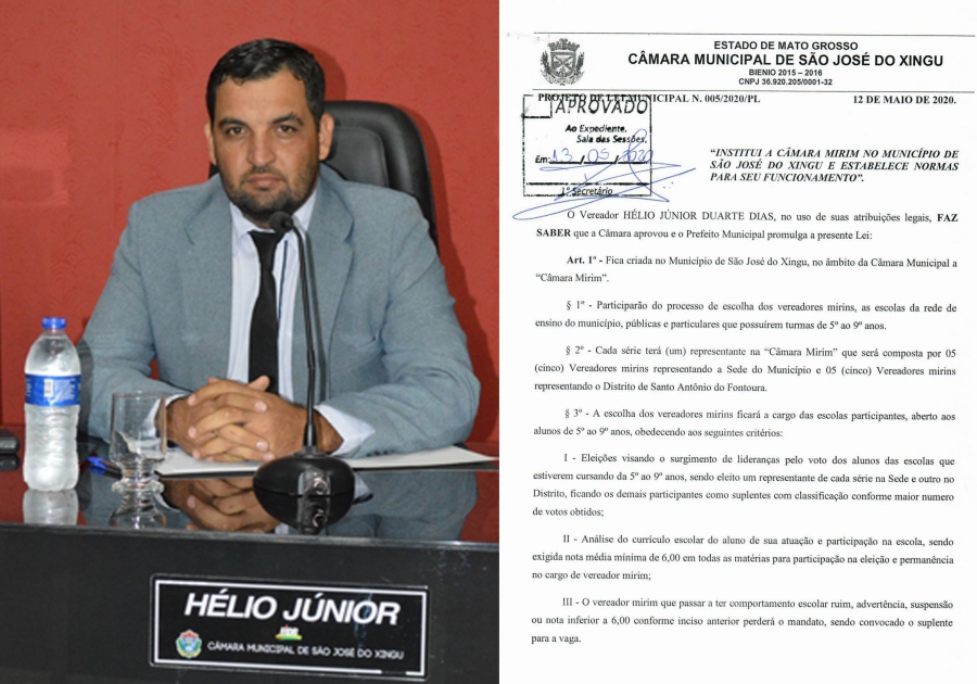 Os vereadores de São José do Xingu aprovaram na última quarta-feira, dia 13, a criação do Projeto Câmara Mirim, no âmbito da Câmara Municipal de São José do Xingu. A proposta, de iniciativa do Vereador Helio Junior Duarte (vereador Helinho), a Câmara Mirim visa estimular a participação política da juventude, propiciando aos estudantes momentos de reflexão e estudo sobre o papel do Poder Legislativo Municipal e a importância da política numa sociedade democrática.